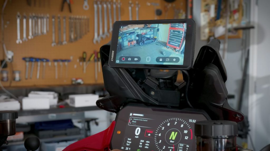 Installation is straightforward if the mounting location is decided up front; the system needs a switched power source and basic wiring to the battery, and camera feeds require only a single power line each. On a modern multitool bike the reviewer tapped a GPS plug behind the windscreen and ran tidy leads under the bodywork, finishing the whole install in roughly 90 minutes. The modular mount makes swapping between machines painless, and the wireless remote option keeps inputs hand‑friendly without constant touchscreen use.